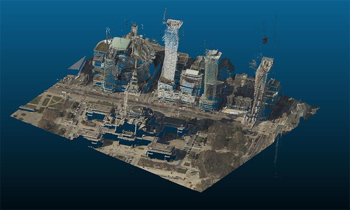 De acuerdo con lo mencionado anteriormente, los productos generados por drones pueden usarse como fuentes de datos en el análisis SAMPLE. En concreto, los vuelos con drones de este proyecto se utilizan para generar nubes de puntos precisas. Esto permite una mayor precisión de los productos finales, como modelos digitales de superficie fiables y apoyo a la movilidad aérea urbana.